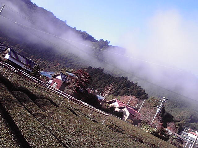 昨日は雨だったが、今朝は青空が広がりました。川根茶産地の山々には濃い霧がかかっていました。