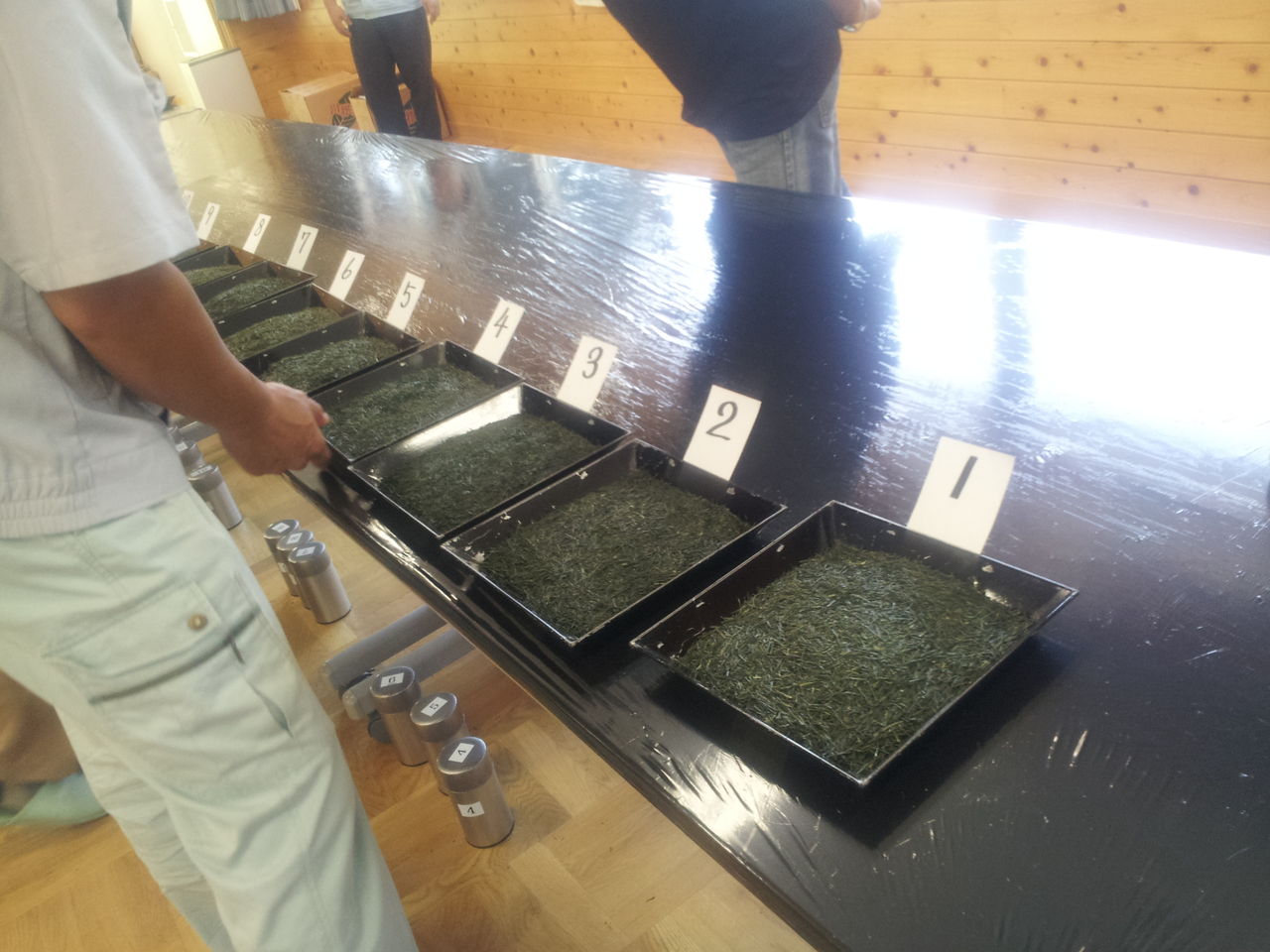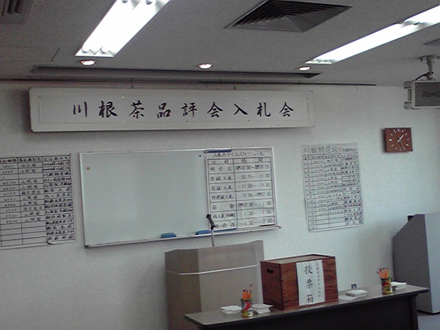 今日は川根茶業協同組合主催の第50回川根茶品評会の入札販売会が開催されました。品評会で順位が決まったお茶を入札によって、落札業者が決まります。金額を決め、写真中央に写っている投票箱に金額を書いた札を入れます。今年の落札率は良かったようです。がんばろう川根茶